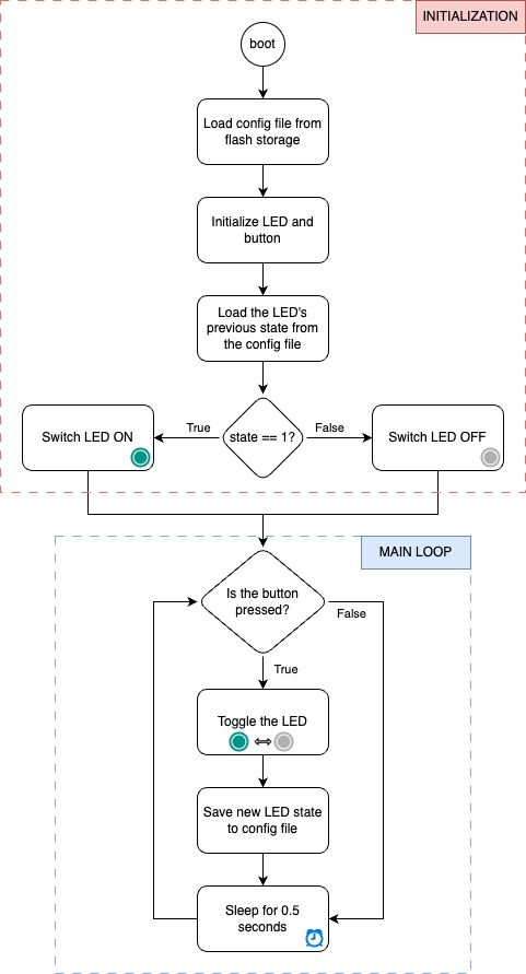 To demonstrate this approach, let's build a simple ESP32 project that lets you toggle an LED by clicking a button, and remembers the LED's last state (on or off) even if it gets unplugged from power. Before we dive in to the code, let's draw out the program flow. It'll help us decide when the program should save the user's settings, and when it should load the previous settings.ÎÎ