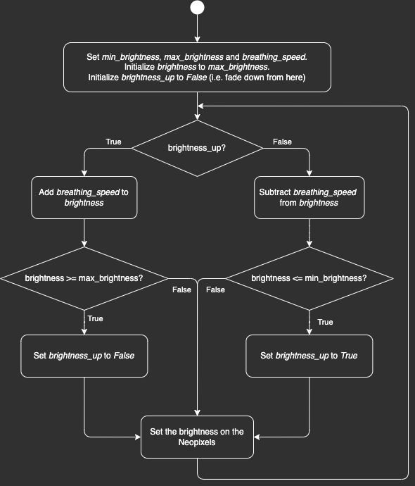 That flowchart is so symmetrical, it hurts. Let's just hope it actually works when translated into code. Modify our previous code to change it from a flashing animation to this breathing animation.