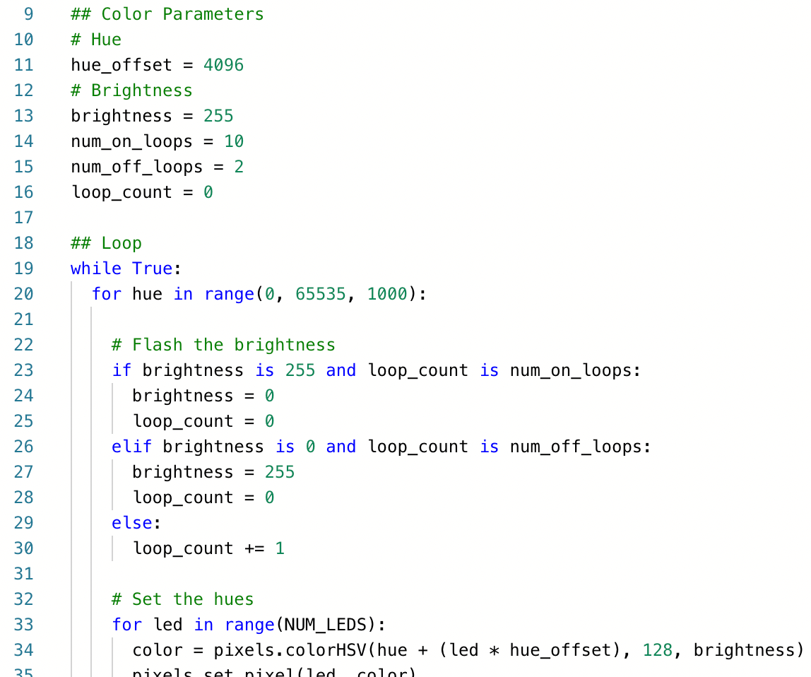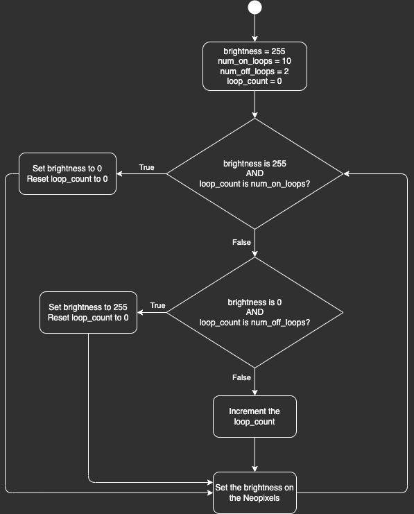 Initially we set the brightness to 255 to start the program with the LEDs on. We create two parameters to decide how long the lights will be on (10 iterations of the main loop) and how long they'll be off (2 loops). We create a variable, loop_count, to track how many loops have passed.