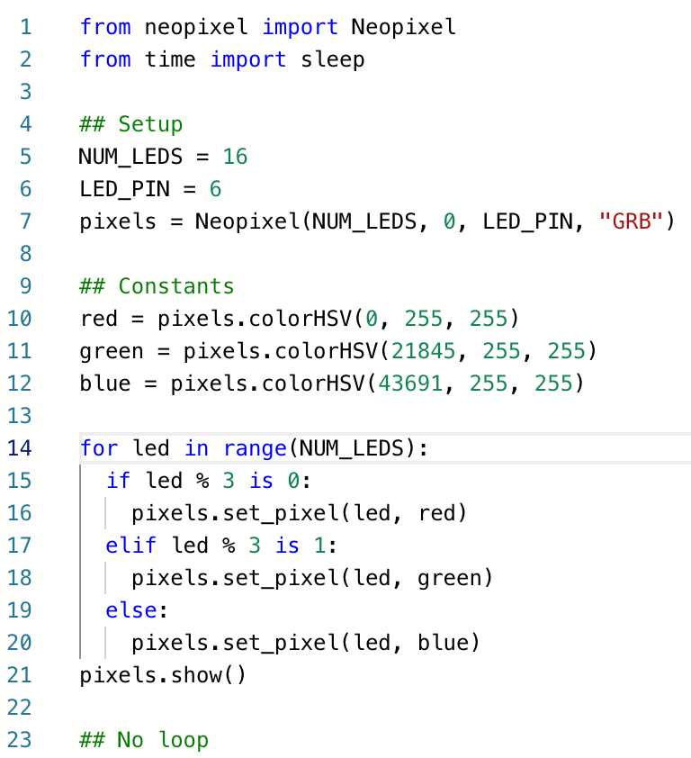 We use the modulus/'remainder' operator, %, to split the LEDs into groups of 3 and set the colour of each LED accordingly - red for the first LED in a group, green for the second and blue for the third. Run the code and check out the result.