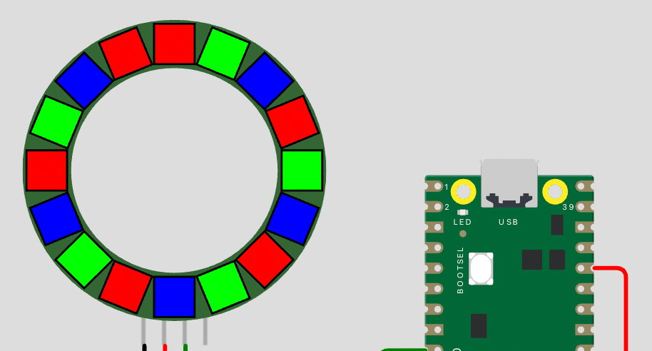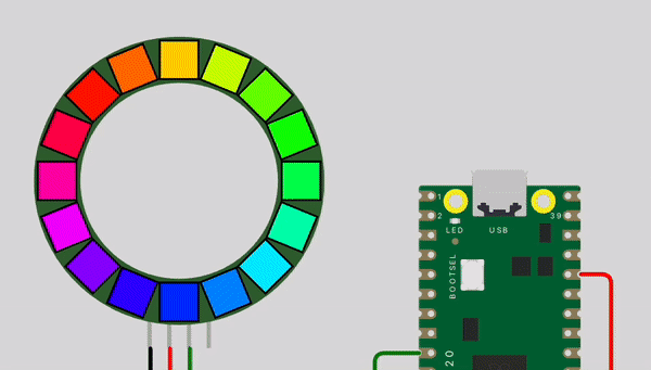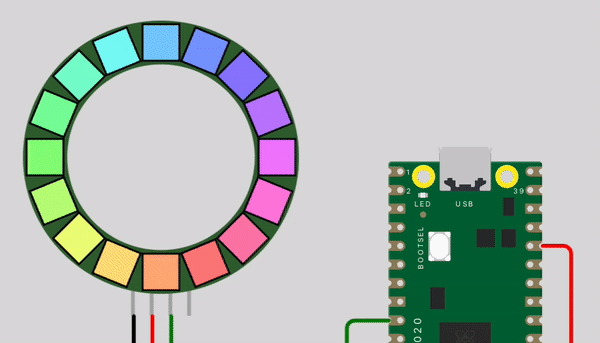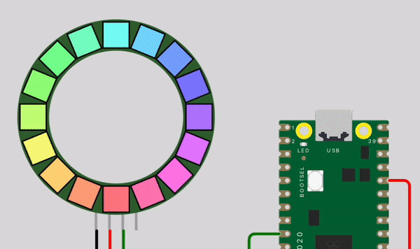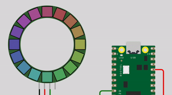 Quick recap: in our previous tutorial, we had connected the Neopixel ring to the Pi Pico like so: VCC connected to the 3.3V supply pin, GND connected to any ground pin, and the DIN (Data In) pin connected to pin GP6. We had also pulled in blaz-r's Neopixel library from github (note: if you're following along on a real Raspberry Pi Pico instead of the Wokwi simulator, you don't need to copy this Neopixel library file to your project - it's already built-in). Finally, we wrote some basic code to control the pixels. To make your life easier, I'm providing the previous project link so that you can just jump in and get started today!