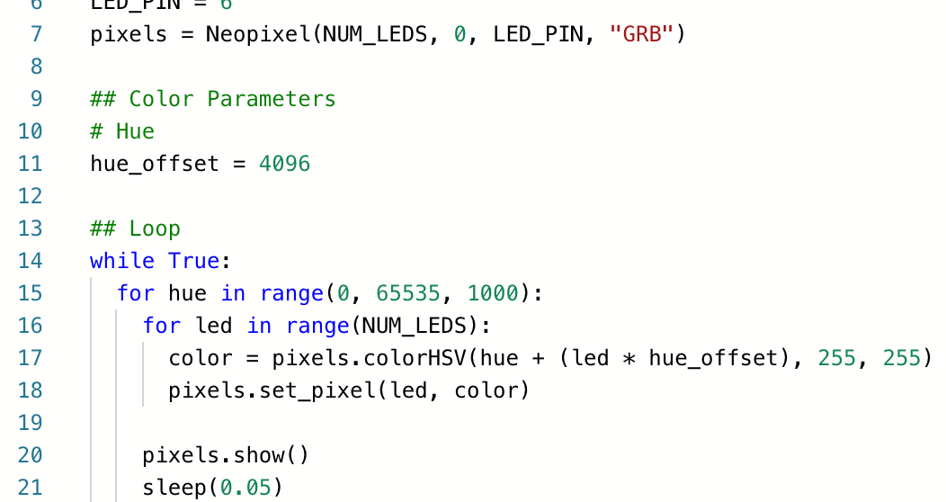 We need to create a loop to cycle through all the hues, and a nested loop inside that loop to cycle through all the LEDs. We'll set the first LED to this 'starting' hue, and all subsequent LEDs to the previous LED's hue plus 4096. Let's modify our code to accomplish this.